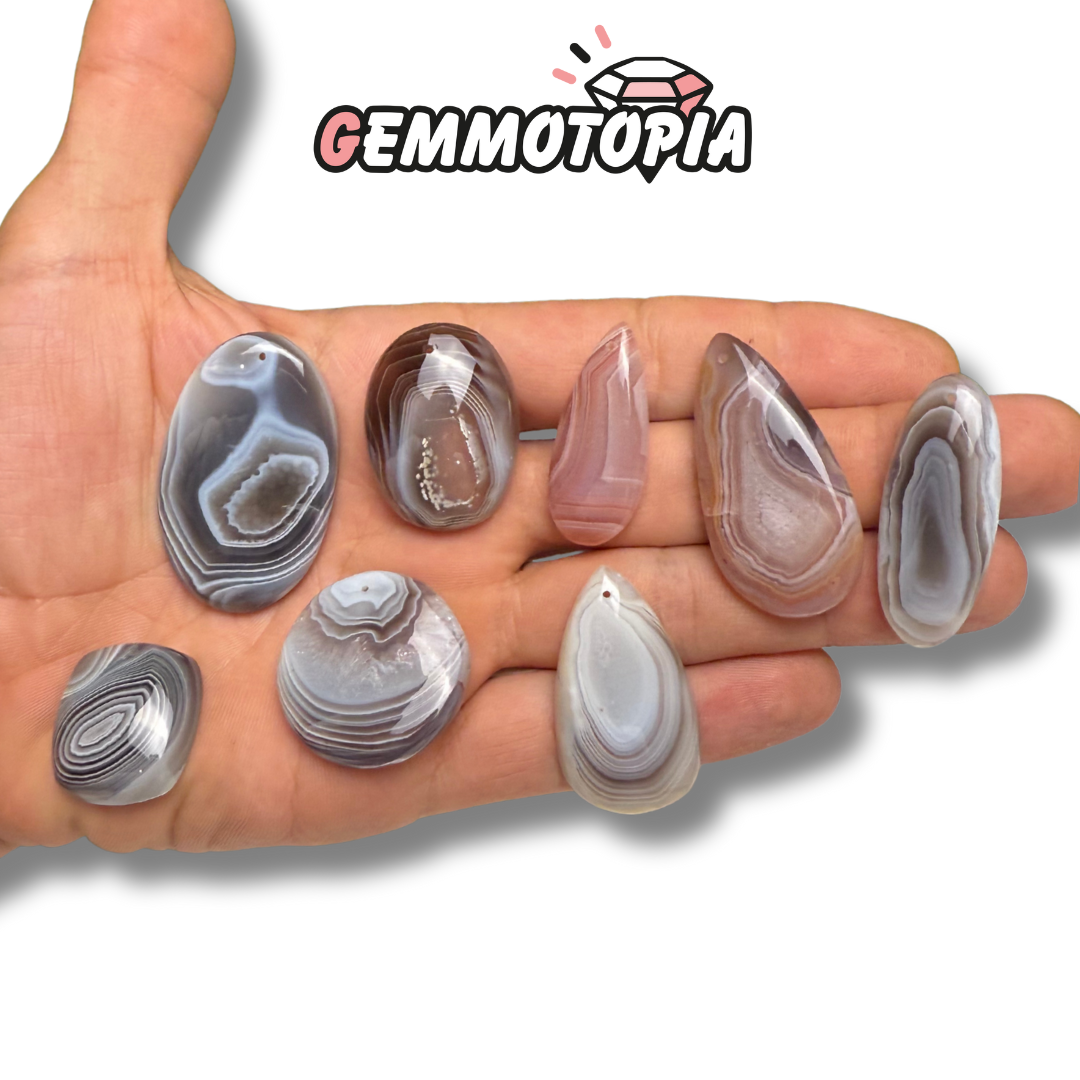 Cette variété rare d’agate provient exclusivement du Botswana, dans des régions volcaniques anciennes. Chaque pierre présente des couches de tons doux, du gris perle au brun rosé, formant des dessins harmonieux et apaisants. Le poli fait ressortir la beauté des lignes et l’effet satiné de la matière.